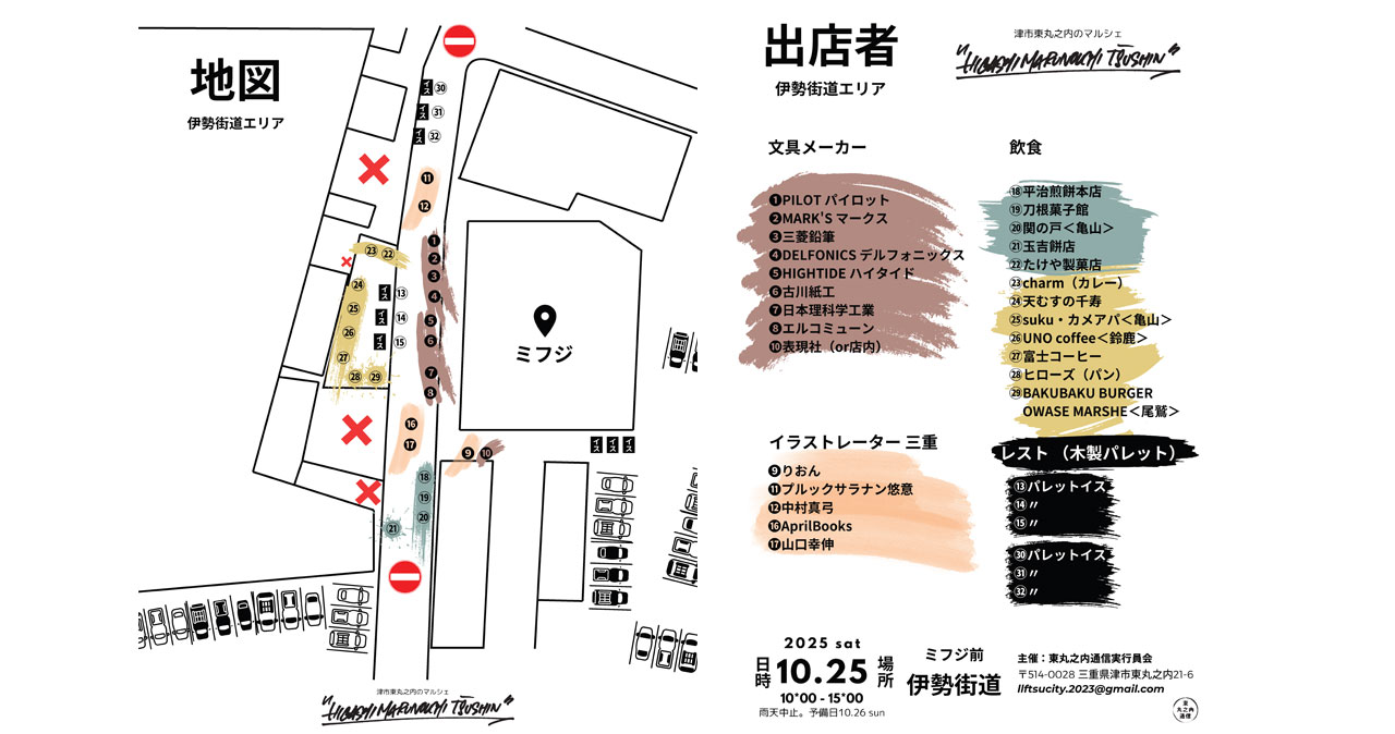 ミフジ前(松菱裏)の伊勢街道を歩行者天国にして、文具メーカー10社弱、イラストレーターや地元の飲食店など総勢30店舗弱が集結して行われるマルシェを予定しています。ミフジ店舗前だけでなく、ミフジ近くのレイメイコーヒーさん前でもマルシェを同時開催します。当日ミフジ前会場マップはこちらから、全出店者一覧はこちらからご覧頂けます。