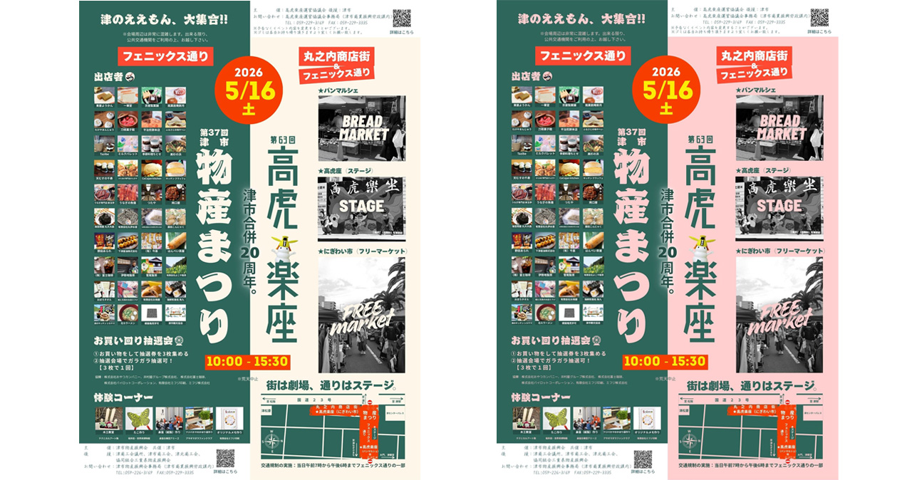 昨年同様、今年も高虎楽座と津市物産まつりを同時開催することになりました。会場はミフジ近隣の丸之内商店街、フェニックス通りになります。また「大門花マルシェ」(大門大通り商店街)、「縁日際」(津観音)も昨年同様、同時開催します。津城模擬櫓も開城して「津城模擬櫓見学」も可能です。どうぞ皆様のご来場心よりお待ちしております。